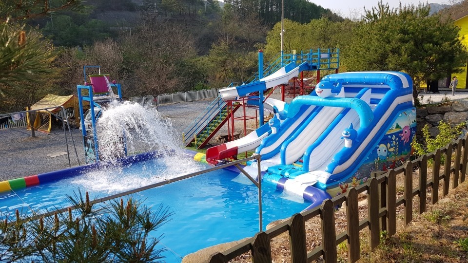 요기는 캠핑장 내 수영장이 특히 매력적입니다. 넓은 수영장에는 직선으로 내려오는 에어 미끄럼틀과 회전 워터 슬라이드가 있어 아이들이 신나게 놀 수 있습니다. 발판이 높은 계단형으로 되어 있어 작은 아이들도 안전하게 수영장에 들어갈 수 있고, 수영장 주변에는 발판 공간이 있어서 아이들이 쉽게 물놀이를 즐길 수 있습니다. 수영장 물 관리는 철저하게 이루어지며, 아침마다 청소하는 모습이 인상적입니다.