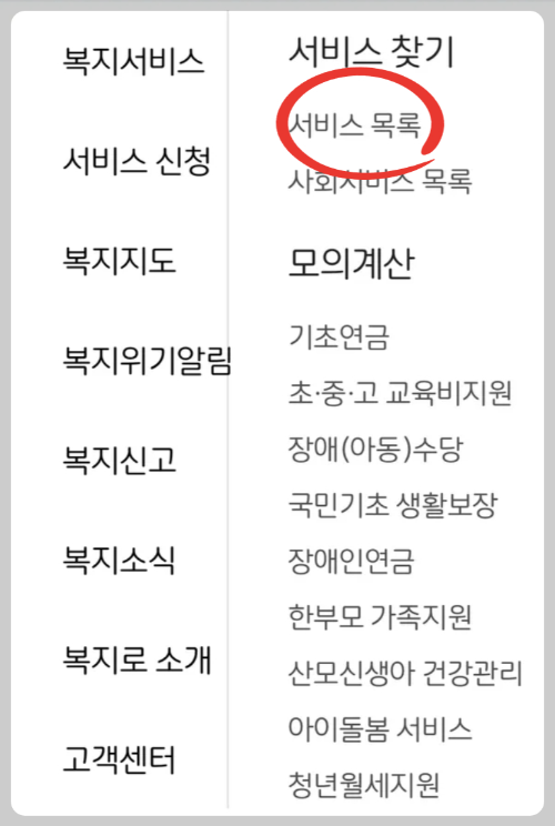 복지서비스 > 서비스 찾기 > [서비스목록]을 클릭합니다.
