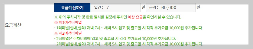 1,2여객터미널 모두 심야 입출고(저녁 7시 ~ 새벽 5시) 일 경우, 각각 만원씩 추가됩니다.