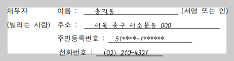 → 예) "채무자 김철수(주민등록번호 800101-1234567, 주소: 서울시 강남구 ...)"