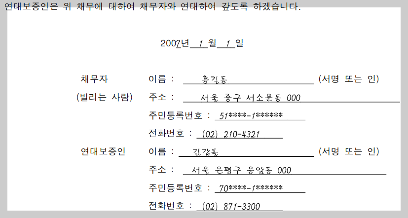 → 예) "채무 불이행 시 보증인 이길동이 대신 변제함"