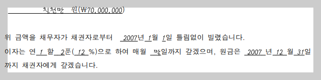 → 예) "차용금: 금일백만원정(₩1,000,000)"