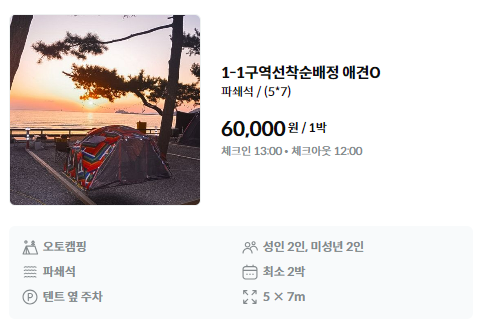 - 단점: 야간에 해변 탐방객에 의한 소음 및 폭죽소음 가능, 2박부터 예약 가능