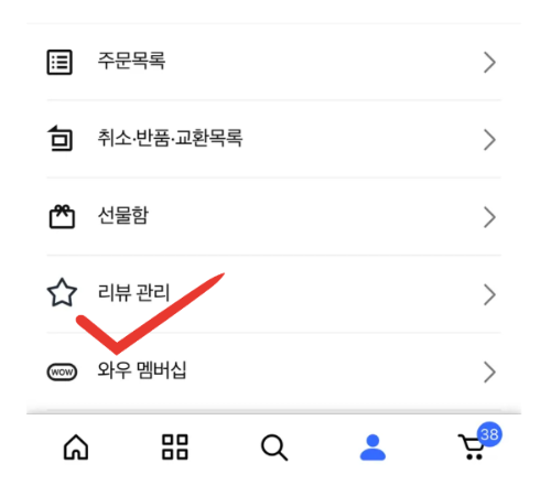 마이쿠팡 페이지에서 와우 멤버십을 클릭합니다.
